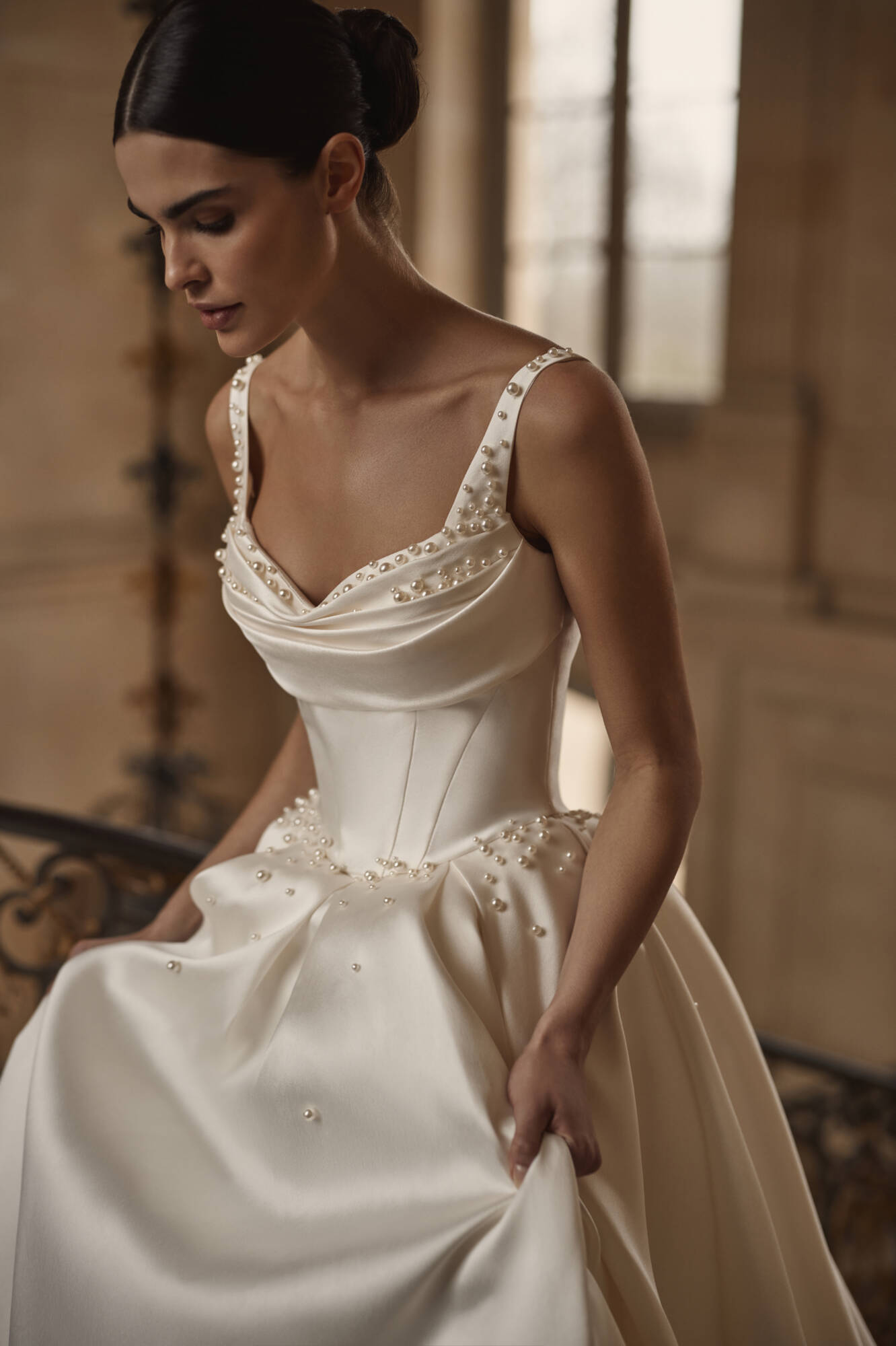 L’abito presenta una delicata dispersione di perle che adornano la scollatura, le spalline e la parte superiore della gonna.
