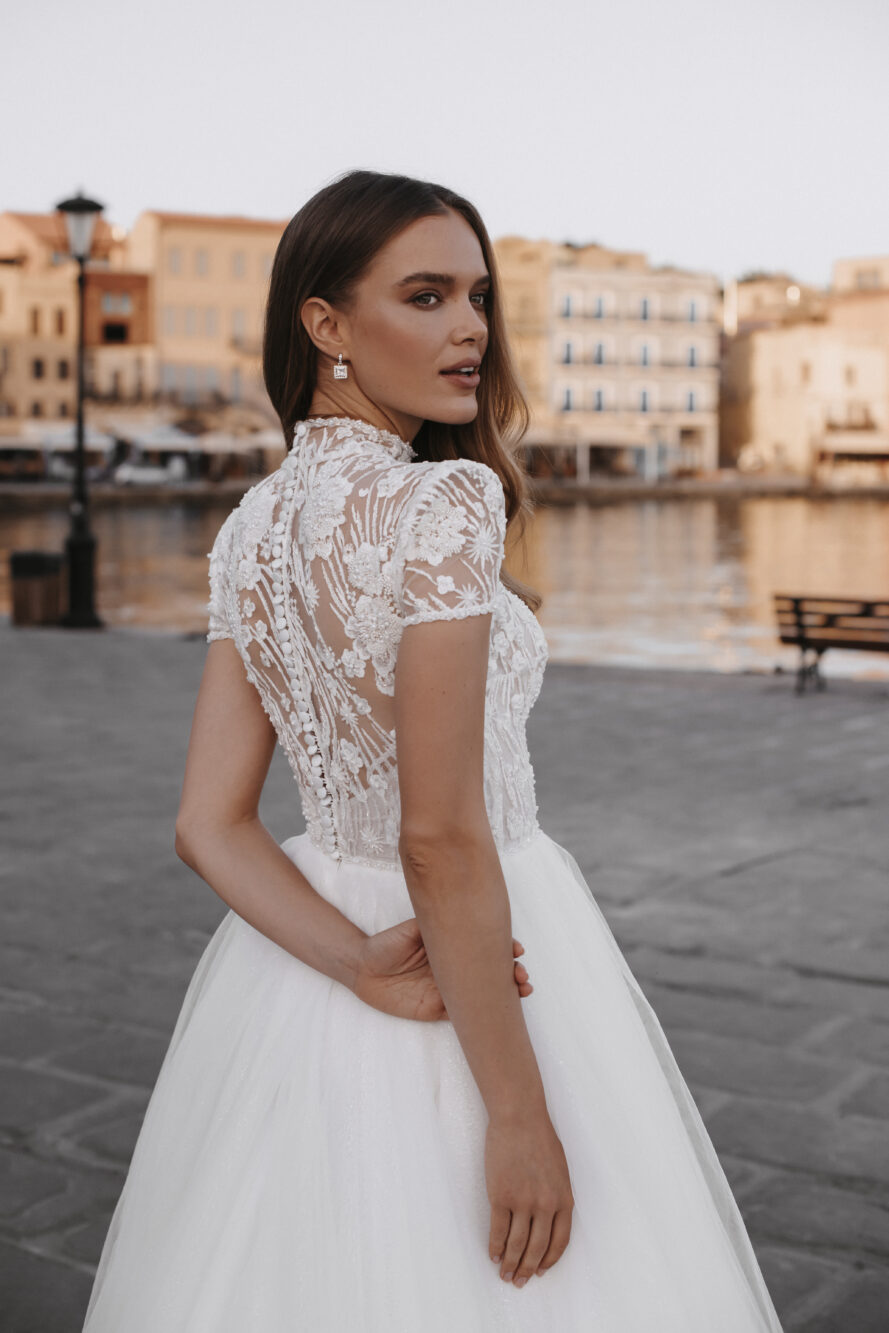 Elegante abito da sposa da matrimonio a maniche corte in colore avorio. Presenta un corpetto a collo alto completamente ricamato con abbottonatura sul retro, applicazioni in pizzo e una maxi gonna in tulle.