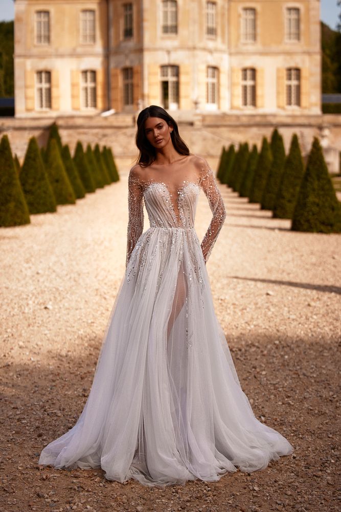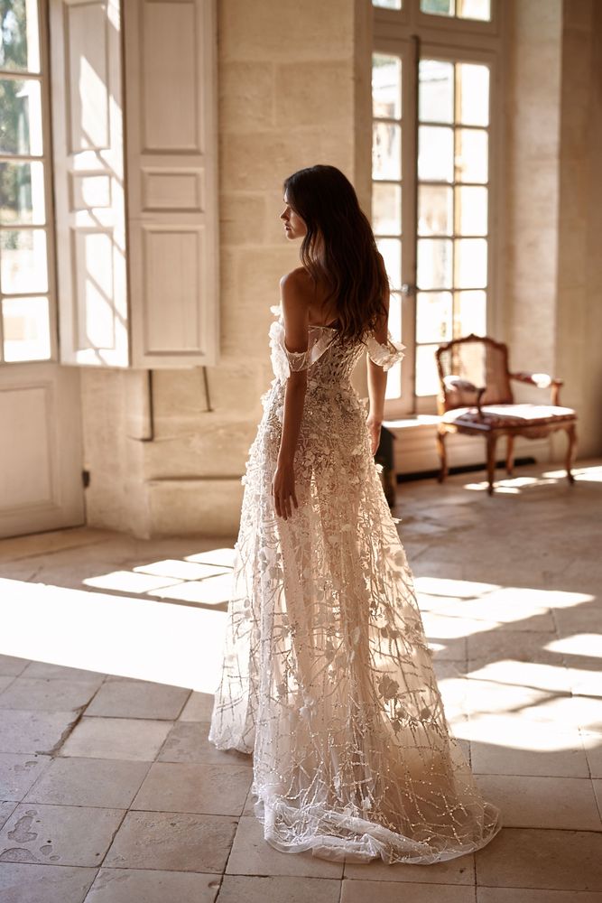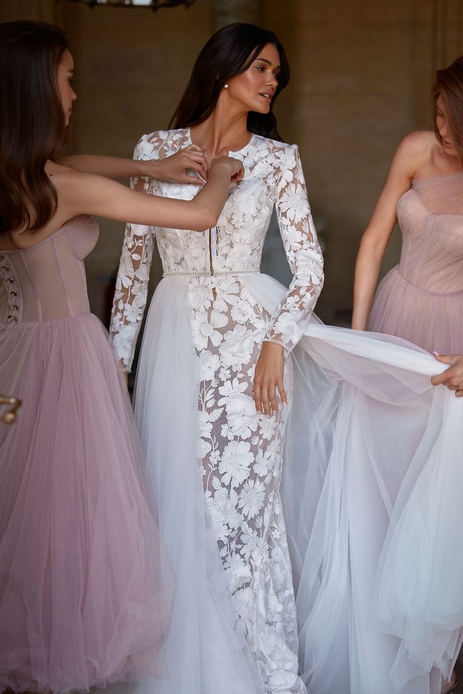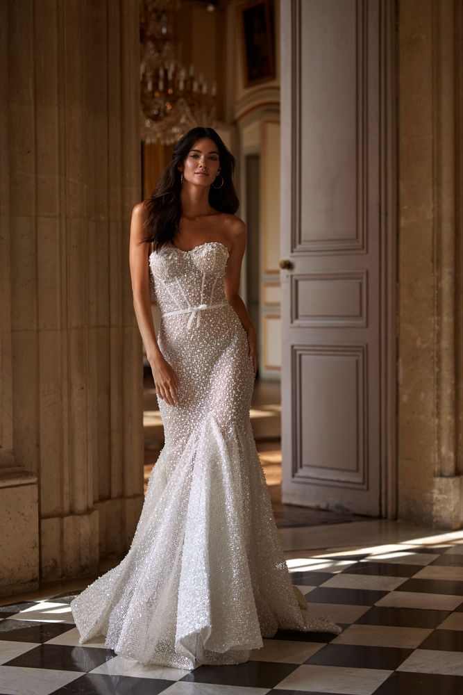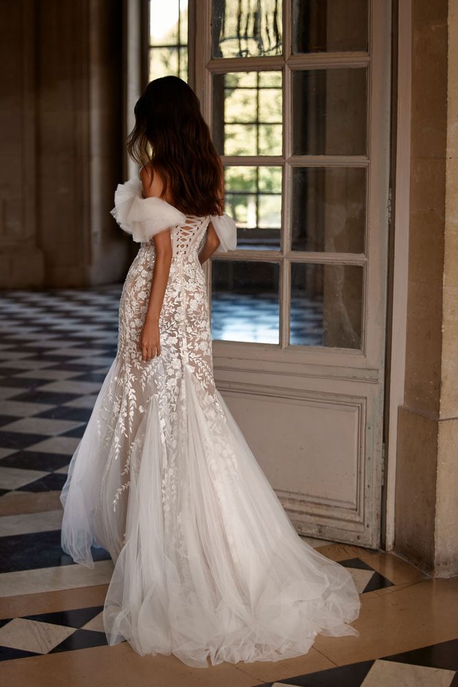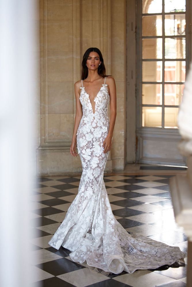 Blair è un abito da sposa a sirena, color nude, adornato da fiori 3D e interamente realizzato in pizzo. Il corpetto ha spalline sottili di perline e graziosi fiocchi staccabili. Questo modello è caratterizzato da un’audace scollatura profonda sia sul decolleté che sulla schiena. Magico ed indimenticabile lo strascico!