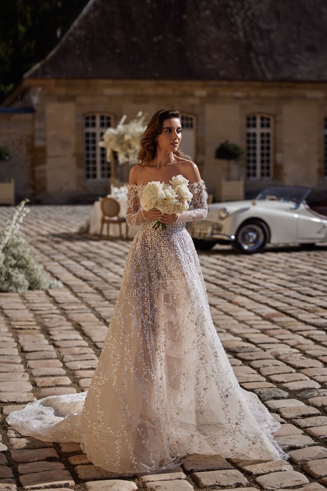 Coco è un abito da sposa di alta moda della linea Star in White di MillaNova, è semitrasparente, è completamente ricoperto di paillettes drammatiche e ricami floreali.