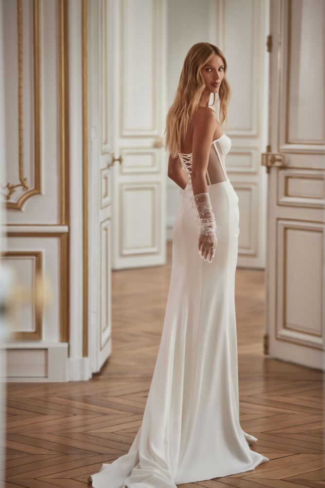Spettacolare abito a sirena con corpetto semitrasparente a forma di cuore e maxi gonna arricciata. Un gilet a collo alto staccabile aggiunge un tocco di eleganza e offre un look 2 in 1.