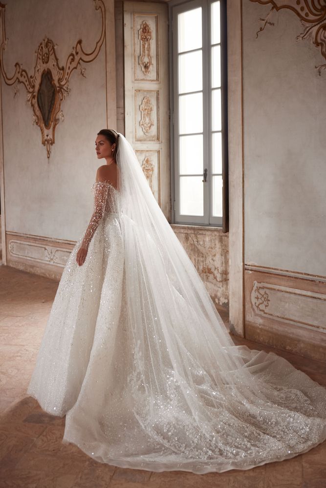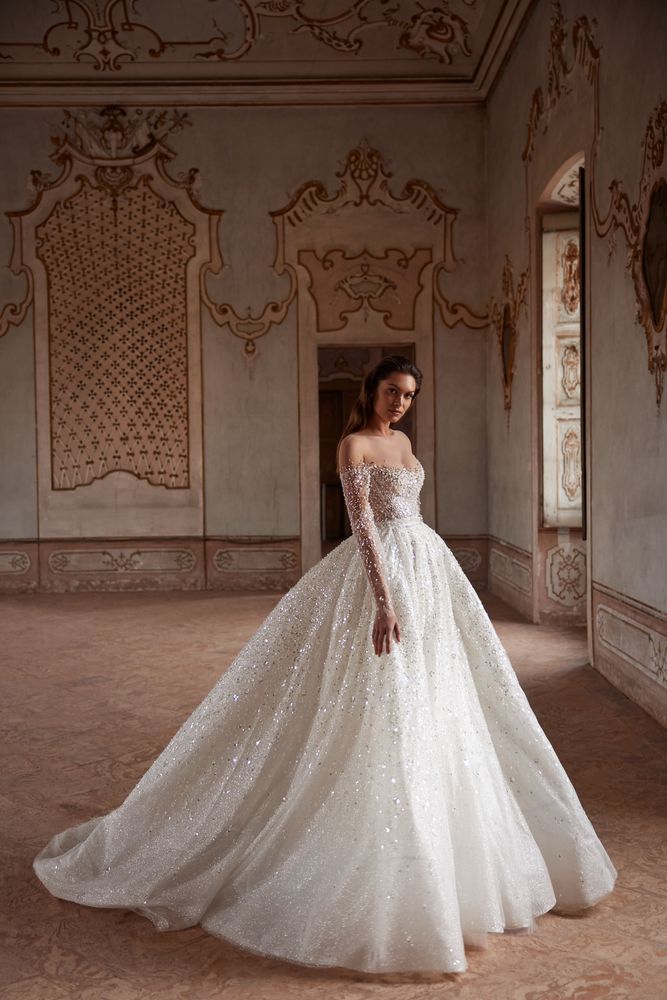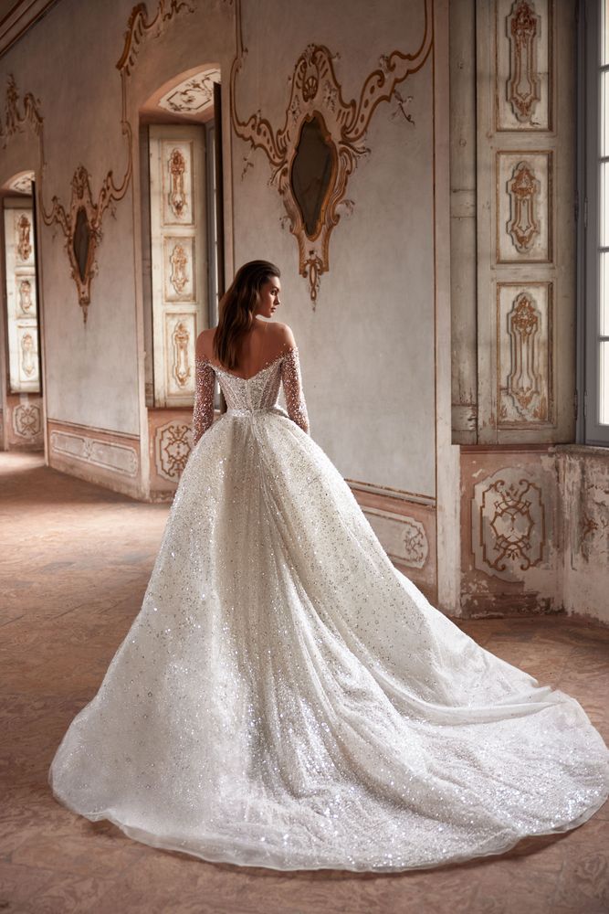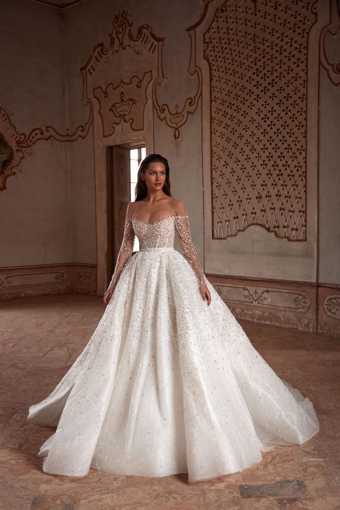 Sfarzoso abito da sposa a maniche lunghe con spalle scoperte presentato in delicato pizzo finemente ricamato con perline e paillettes argentate. Il corpetto decorato e lo scollo a barchetta trasparente rendono la linea delle spalle più visibile evidenziando la vita stretta e giocando con le proporzioni della forma femminile.