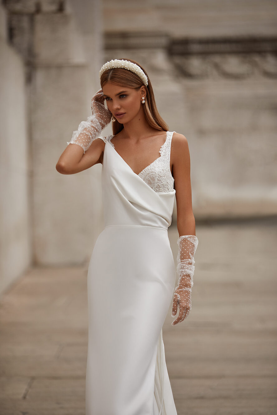 Abito da sposa scivolato, interamente realizzato in raso color avorio. Il modello Neddin è tutto da scoprire, sfoglia la gallery e prenota il tuo appuntamento per indossarlo.