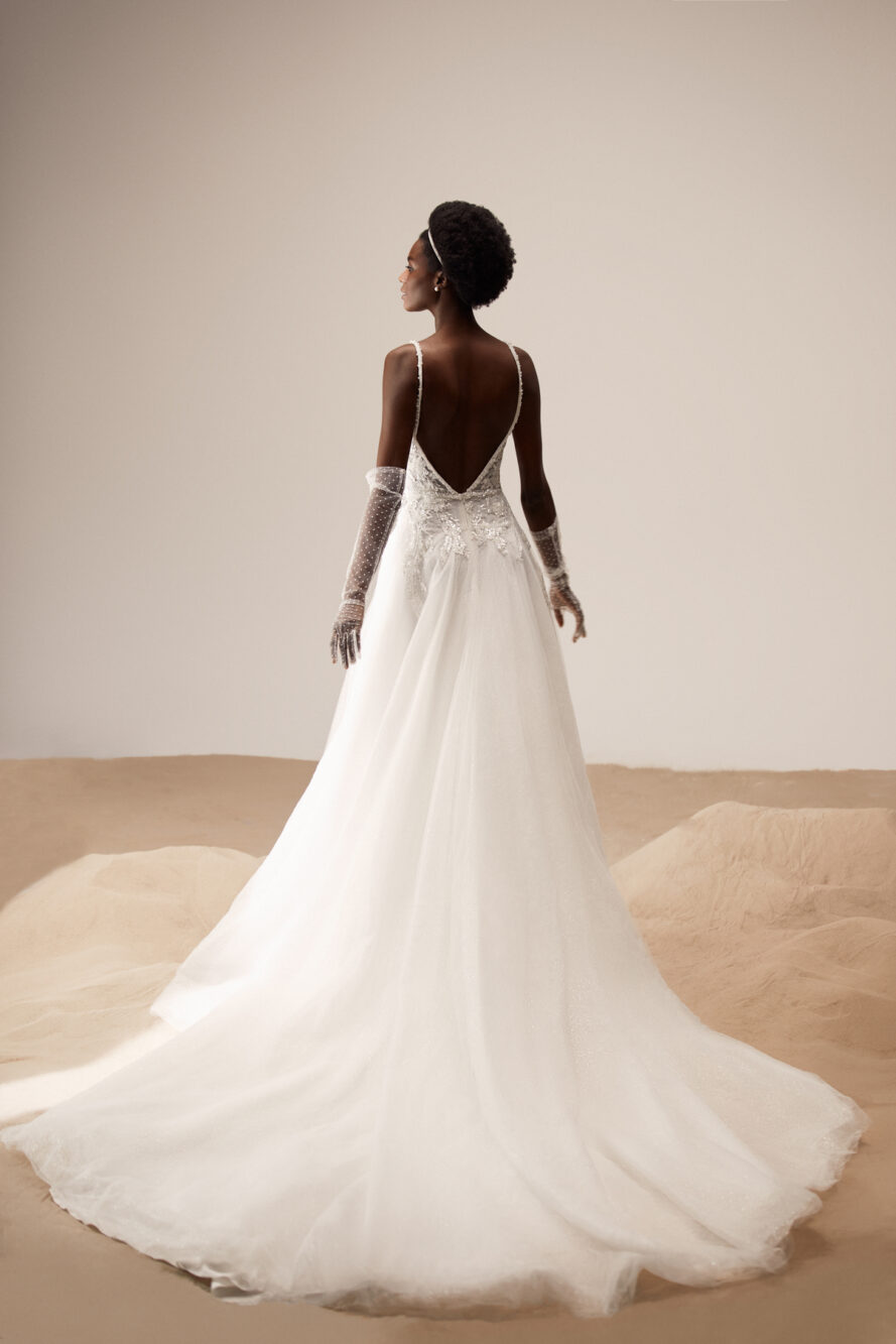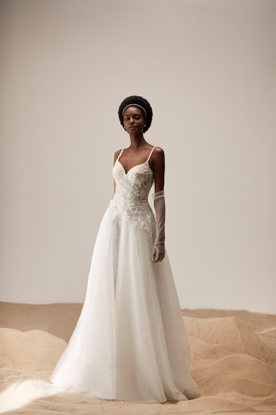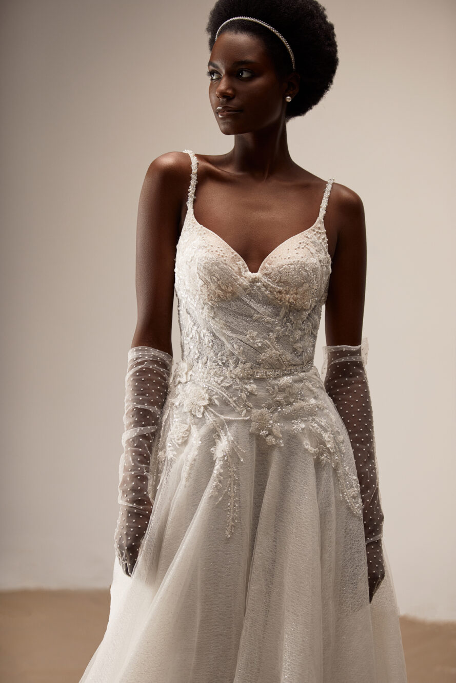 Abito da sposa realizzato in tulle pregiato con spalline e corsetto a cuore impreziosito da paillettes, pizzo e perline.