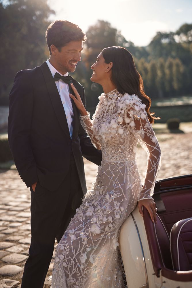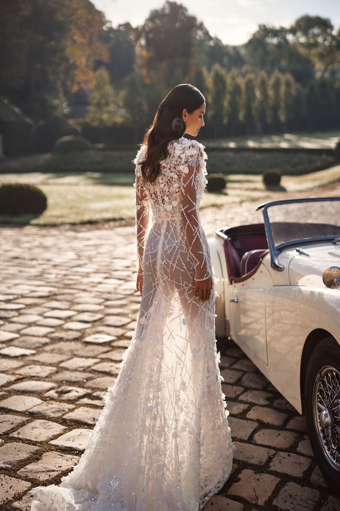 Norma è un spettacolare abito da sposa a maniche lunghe semitrasparente con una silhouette aderente a sirena completamente ricoperta di paillettes e di applicazioni floreali 3D. Caratterizzato da dolcevita, maniche lunghe trasparenti decorate e gonna con paillettes e strascico corto.