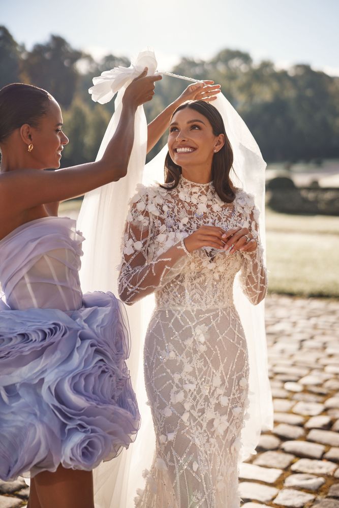 Aggiungi un tocco di romanticismo al look glamour con un lungo strascico di tulle staccabile.